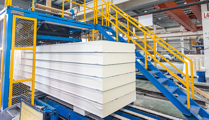 德國引進(jìn)的聚氨酯復(fù)合板全自動連續(xù)生產(chǎn)線克勞斯瑪菲線的車間,其雙履帶壓機(jī)廠36米,可生產(chǎn)250mm厚真正難燃B1級PIR產(chǎn)品。