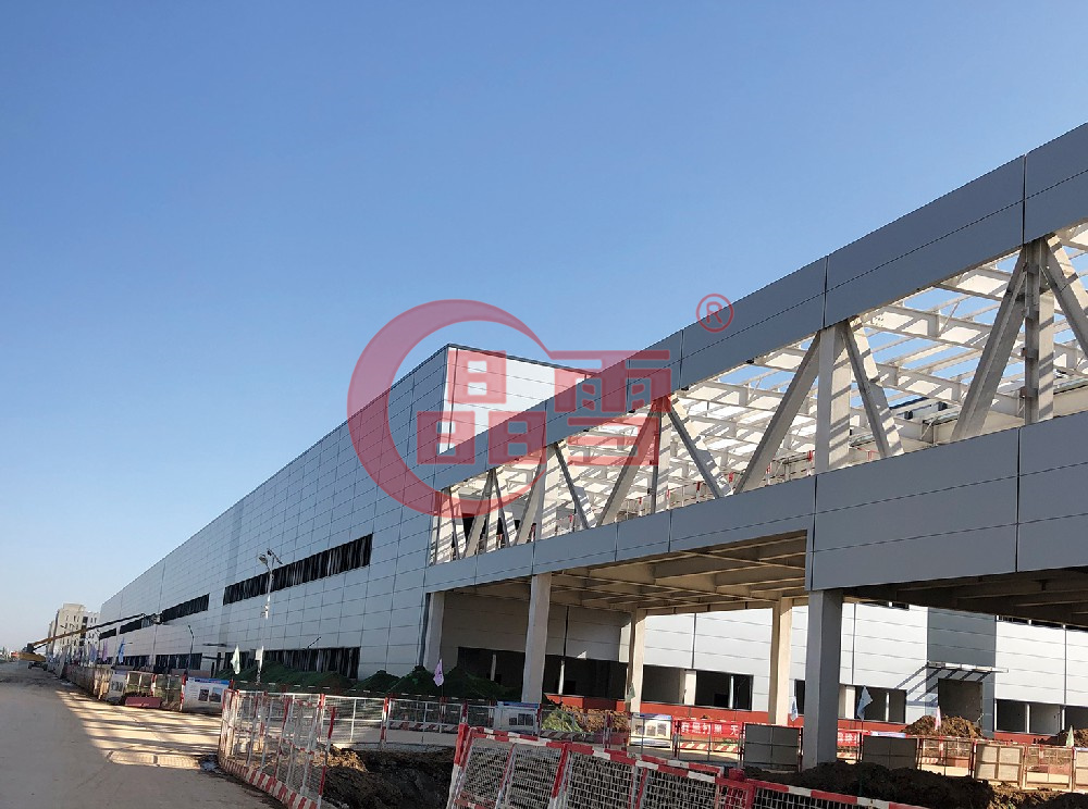 項目位于蘇州市相城區(qū)渭塘鎮(zhèn),占地面積33000m’,是上海菲格瑞特汽車科技股份有限公司的全資子公司。項目采用豎裝形式,使用75mm巖棉夾芯板,板材用量達8700㎡。